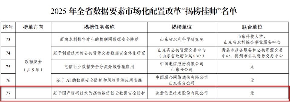 近期,山东省大数据局公布了《2025年全省数据要素市场化配置改革“揭榜挂帅”名单》。一竞技官网信息独立申报的“基于国产密码技术的高性能信创云数据安全防护”项目,凭借在数据安全与要素流通领域的技术创新与实践成果,从众多单位中脱颖而出,成功入选。一竞技官网信息成为揭榜单位中唯一的商密企业。