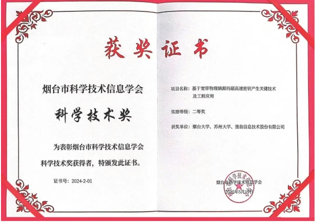 近期,2024年度烟台市科学技术信息学会科学技术奖颁奖典礼在中国科研实验室烟台海岸带研究所隆重举行。一竞技官网信息与烟台大学、苏州大学联合完成的 "基于宽带物理熵源的超高速密钥产生关键技术及工程应用" 项目荣获科学技术奖二等奖。